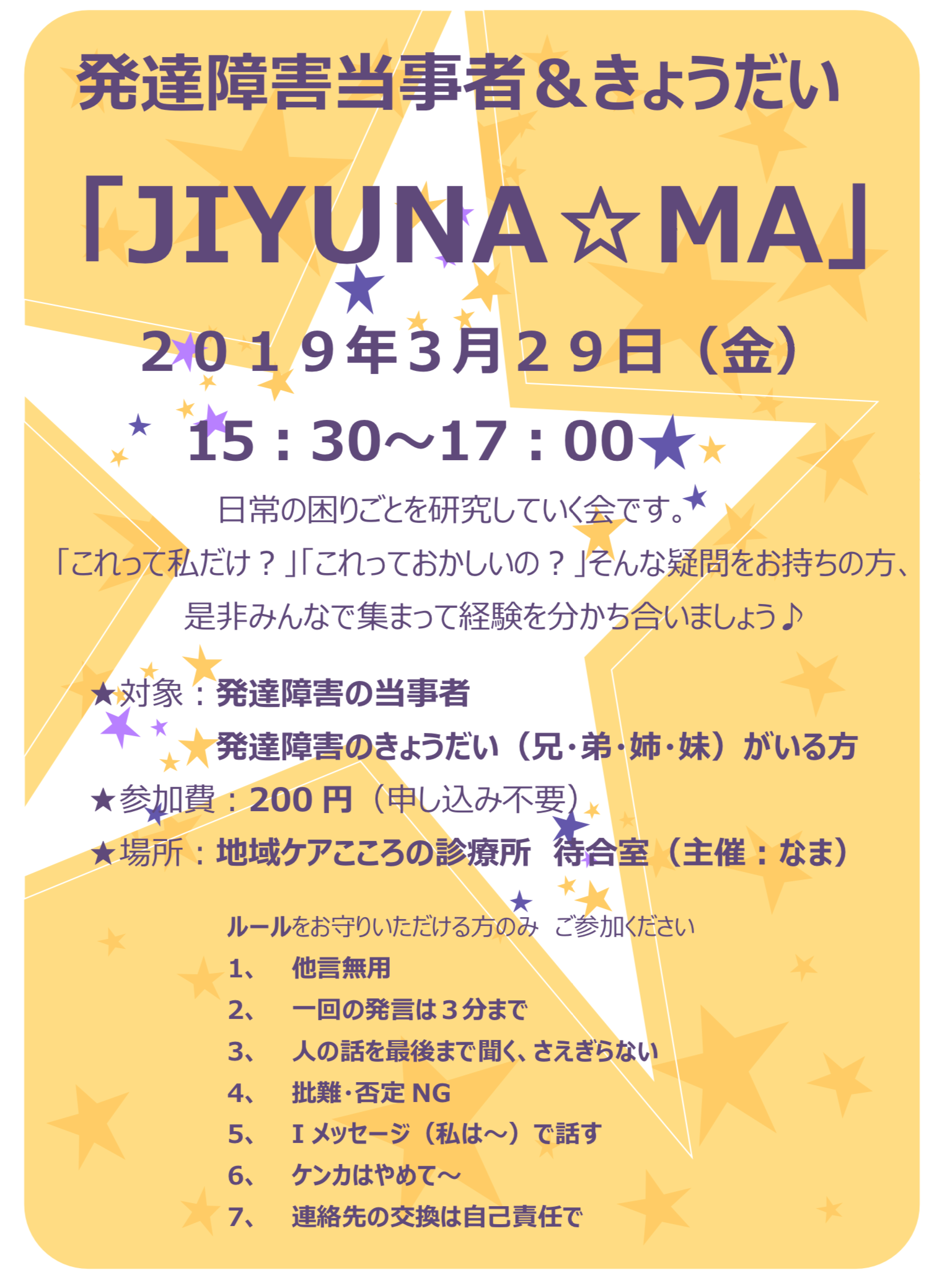 - 3/29(金)発達障害当事者&きょうだいの会「JIYUNA☆MA」